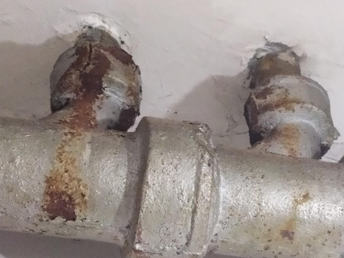 3、先把铸铁管拿铸铁焊条改成立式朝向下水,接着在后接管件顶端预置一个接头,再把自家下水的PVC管接到接头里面,把此接头朝着自家下水的窟窿,之后在铸铁接头内,PVC管周遭打上防水腻子,最后抹上防水胶即可。